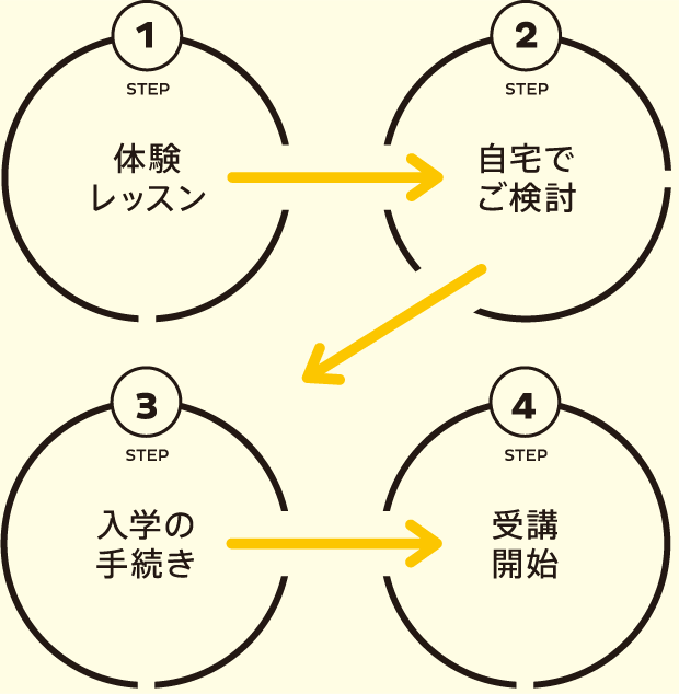WEBサイトやパンフレット、体験レッスンなどを基に、納得のいくまでご検討ください。一部科目を除いて随時入学を受け付けています。分からないことがあればお気軽にお問合せください。