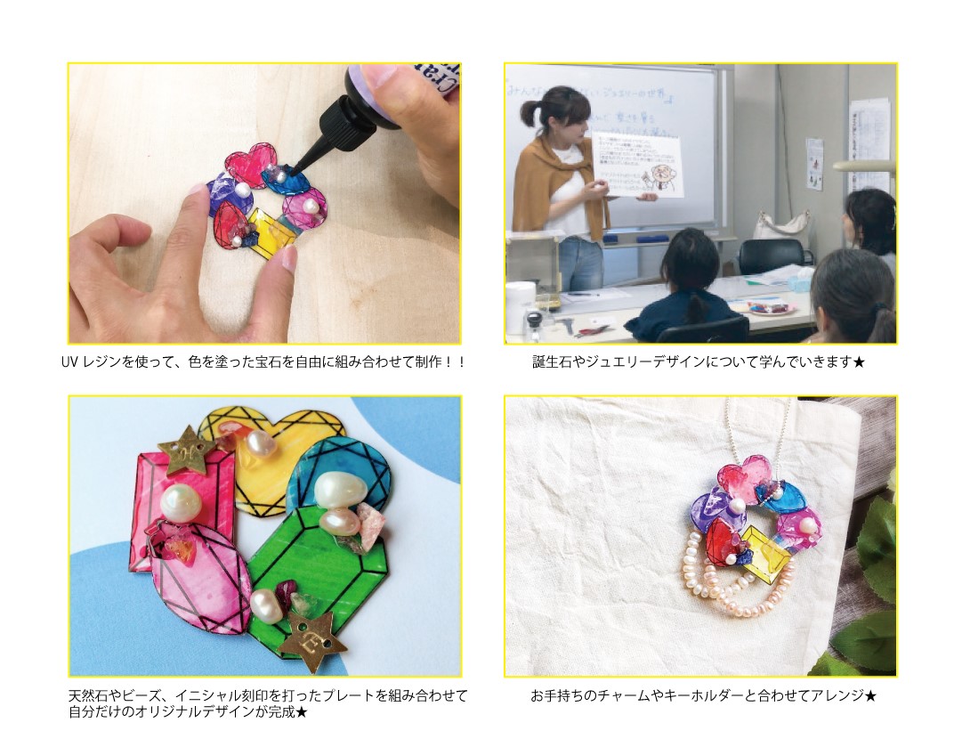 自分の誕生石を実際に描いたり、どの様にデザインしていくのか学びながらUVレジンを使ってオリジナルブローチを作ります。