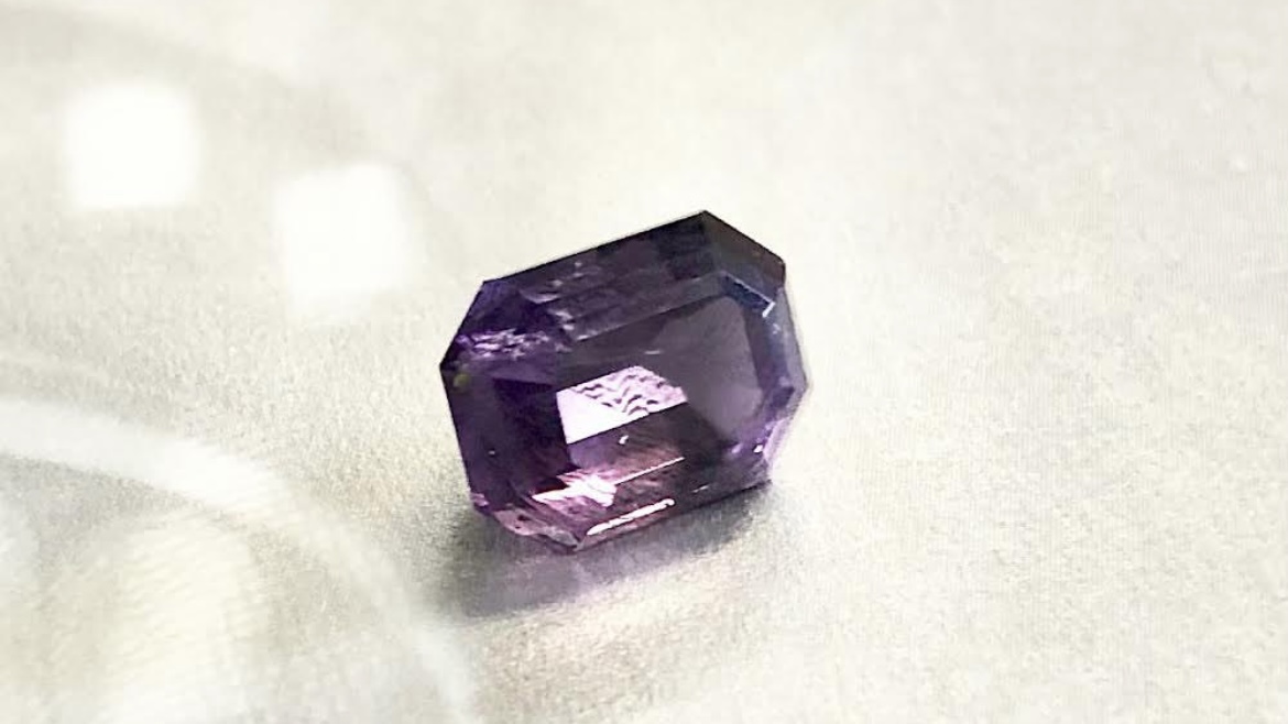 宝石研磨の生徒さんが、授業で研磨したアメジストです。エメラルドカットは基本的なカットのひとつで、宝石の色を引き立たせるカットになります。宝石研磨には体験と入門がありますので、ぜひお越しください。