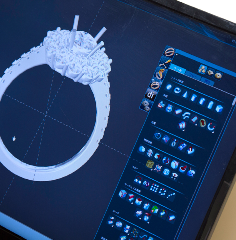 コンピュータを使ってジュエリーの立体的な図面を描く技術のこと。データを使って造形機で原型を作ることができます。JJACはフランスのソフト「3DESIGN」を導入。
