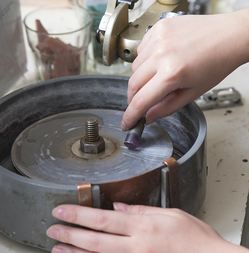 「カボッション」と「ファセット」2つのカット技法を、彫刻、変形など段階を踏みながら指導。ドーム型・山形の丸みのある形状にする「カボッションカット」、ブリリアントカットに代表される「ファセットカット」は、日本で減少傾向にある宝石カット技術。自分だけのオリジナルカットやリカットも学べます。石の性質を見極めながら、一貫した宝石研磨の技術と理論をマスターでき、宝石の知識も身につきます。