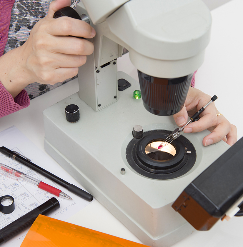 ジュエリーの制作や販売、購入において、宝石を知ることは重要な要素。宝石の魅力や奥深さは宝石学に沿って科学的な検査を行い、その結果から判断できます。座学では、宝石学に加えて宝石の産地や歴史、エピソードなど、多方面から総合的にアプローチ。実習では、双眼顕微鏡をはじめとする多数の機器を使用します。アドバンス試験(実技)に合格すると、JJACの「宝石鑑定鑑別士認定証」のディプロマが授与されます。