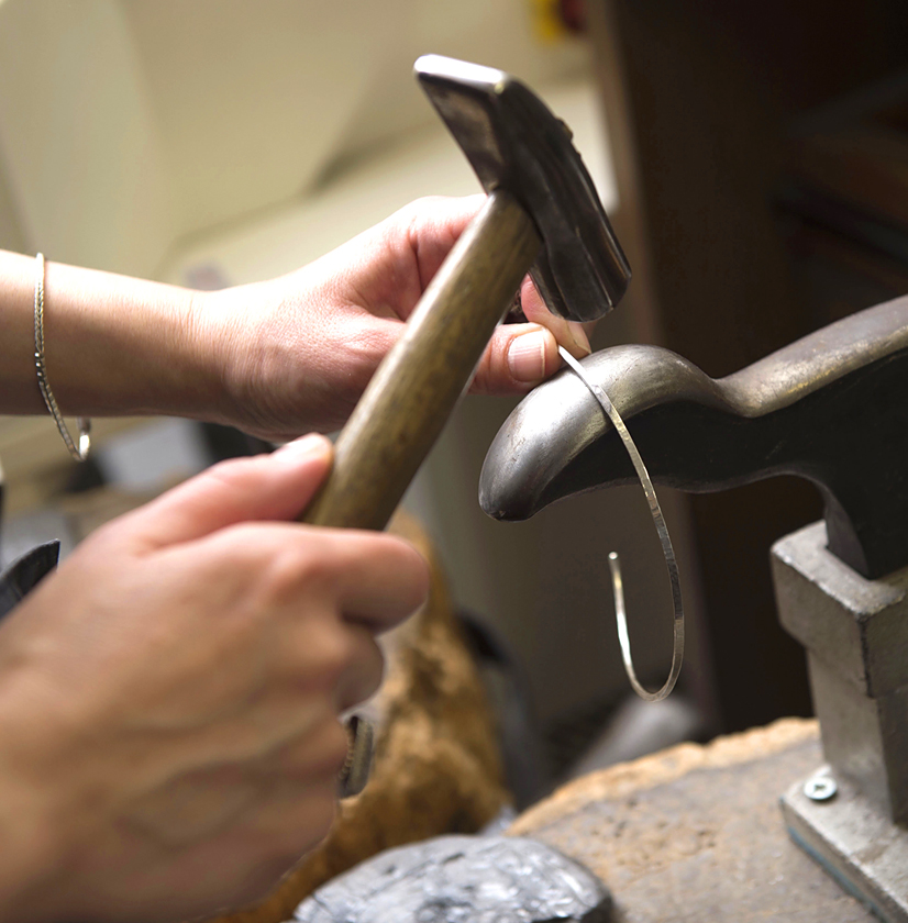 工具の使い方に始まり、地金の切り方から、付け方、削り方、叩き方、石留め、仕上げまで、ジュエリー制作における一連のベーシックな金属加工技術を伝授。金属それぞれの特徴に合わせた細工方法や、制作における理論や技術まで体系的に教えることで、一流のクラフトマンに育て上げます。ファッションジュエリーから高級志向のハイジュエリーまで、様々なデザインに対応すべく、ジュエリーメイキングの腕を磨く授業です。