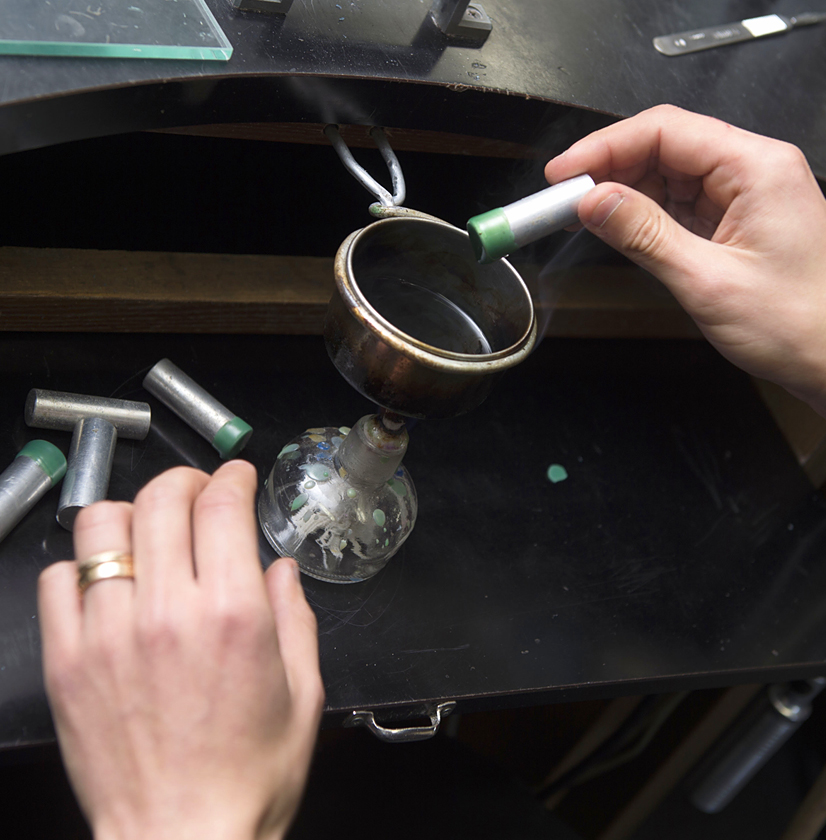 JJACの創始者が海外から日本に持ち込んだオリジナル技法です。「ロストワックス技法」と呼ばれるジュエリー制作の一環で、柔らかいワックスを使ったジュエリー原型を作る技法を指導。その原型の作り方を基にキャスト(鋳造)を行いジュエリーに仕立てていきます。表現の幅が広く、個性的な作品の作成や変形した石を使ったジュエリー制作にも効果的。基本的な型作りから表面のテクスチャー、石留めのテクニックなども教えます。